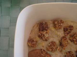 - 1/3 c oats, 1/3 c vanilla soymilk, 1/3 c water, 1/2 banana